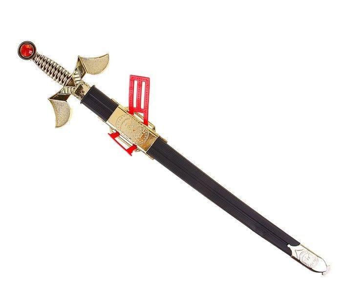 Сабля с оригинальной рукояткой и черными ножнами. Рукоятка украшена большим красным камнем, а ножны декорированы наконечником и накладкой с изображением птицы. Сабля сделана из пластика, имеет длину 65 см и прекрасно дополнит костюм рыцаря, пирата или короля.