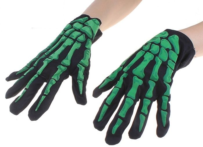 Светоотражающие перчатки скелета черно-зеленого цвета станут отличным аксессуаром к костюмам зомби, скелетов и мертвецов. Размер перчаток 10х23 см.