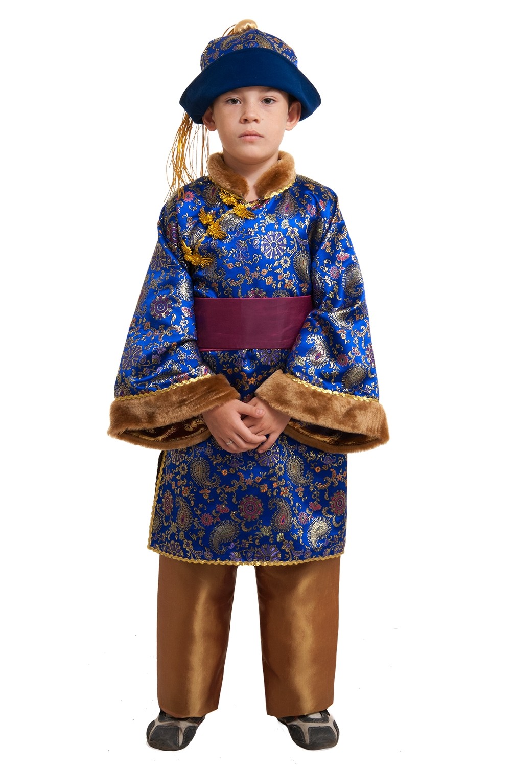 Детский костюм Китайского императора - шикарный костюм, выполненный в китайском стиле. В комплект входит синее кимоно с золотистыми узорами и меховой отделкой, золотистые брюки свободного кроя, широкий пояс, а также синяя шапка с золотистыми узорами.