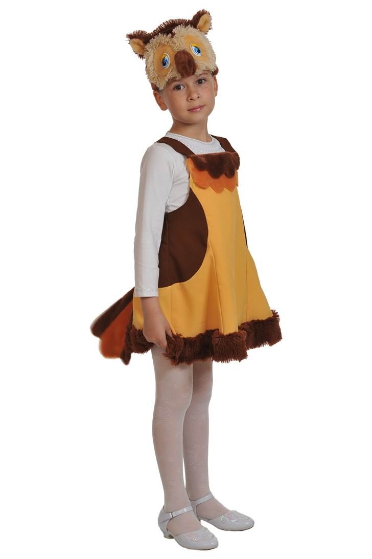 Детский костюм Совы выполнен в коричневых цветах. В комплект входит сарафанчик с темными вставками, а также шапочка-маска, выполненная в виде мордочки совы из мягкого плюшевого материала.
