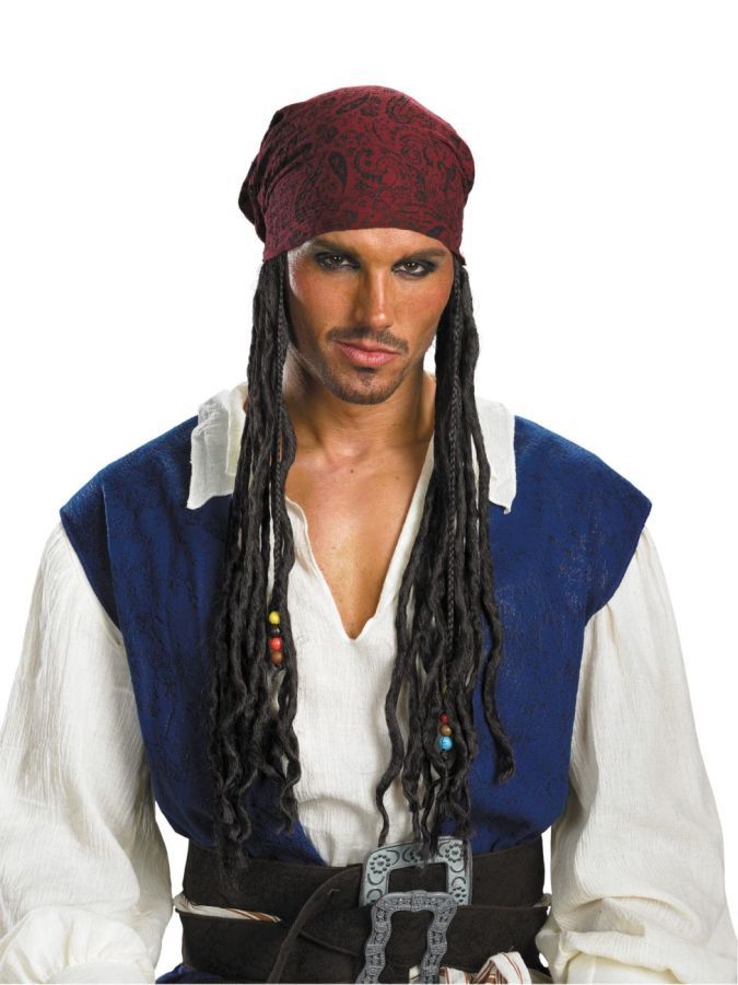 Причёска Джека Воробья - это красная бандана с прикреплёнными чёрными волосами. Этот аксессуар станет хорошим дополнением к костюму Джека Воробья, добавив некоторые аксессуары, вы сможете сделать свой образ весьма похожим на образ знаменитого пирата.