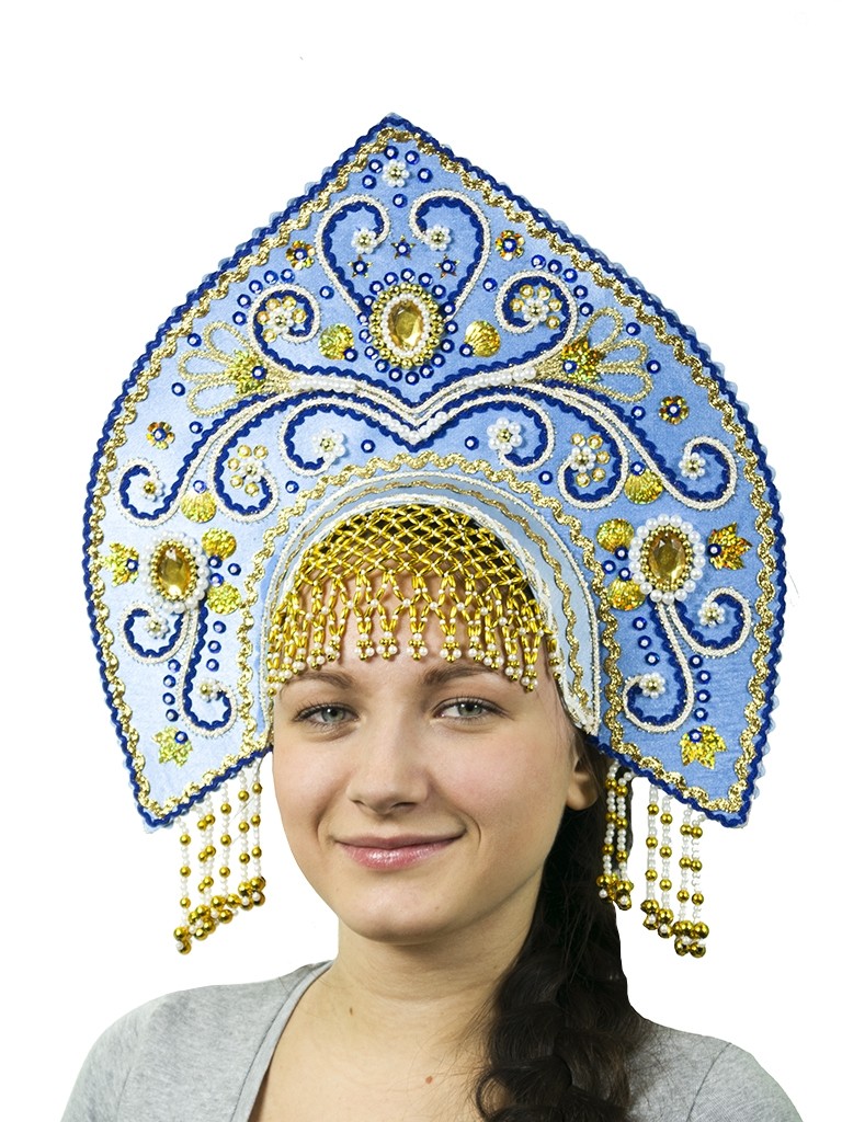 Голубой кокошник Купола - высокий кокошник с атласной отделкой, который украшен аппликациями из синей и золотистой тесьмы, а также пайеток и золотистых бусинок. Кокошник фиксируется на голове при помощи эластичной резинки и длинных ленточек.