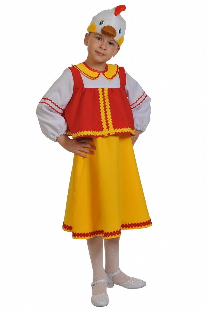Маскарадный костюм Курочки Рябы - яркий детский костюм, который идеально подойдет для постановки детских спектаклей. В комплект яркая длинная юбка с красной отделкой по подолу, красно-белая рубаха с желтой тесьмой и белая маска в виде мордочки курочки.