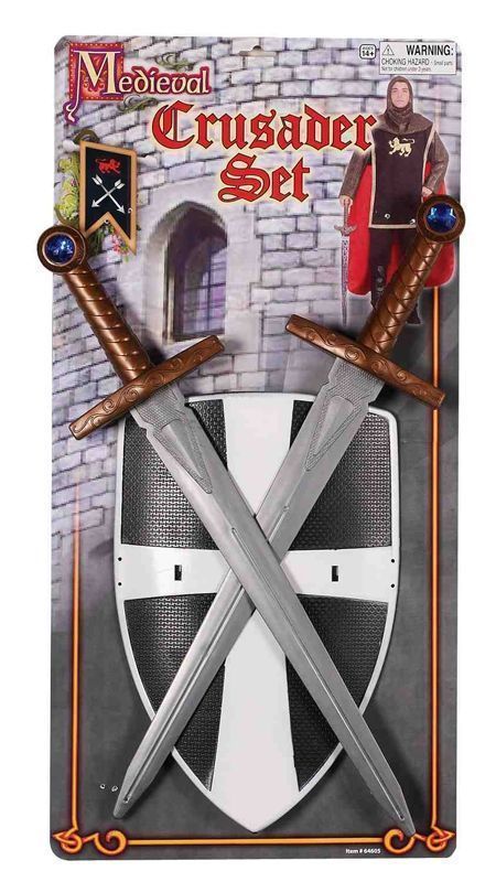 Этот набор крестоносца может хорошо дополнить костюмы рыцарей, борцов и просто средневековых людей. В комплекте набора имеется два меча с золотыми рукоятками и щит с крестом.
