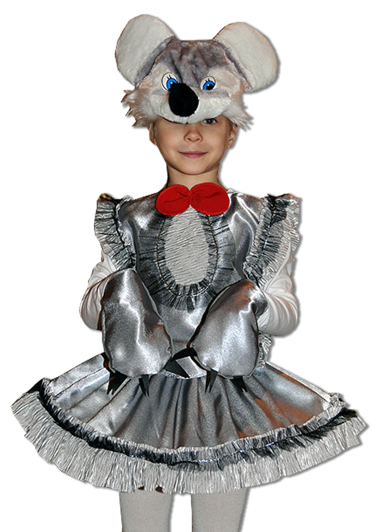 Детский костюм маленькой мышки выполнен в сером и серебряном цветах. В комплекте мягкая шапочка-маска с ушками в виде мордочки мышки, серебряный блестящий жилет с красным бантиком-бабочкой, пышная юбочка с кружевной оборкой, а также блестящие серебряные перчатки в виде лапок мышки.