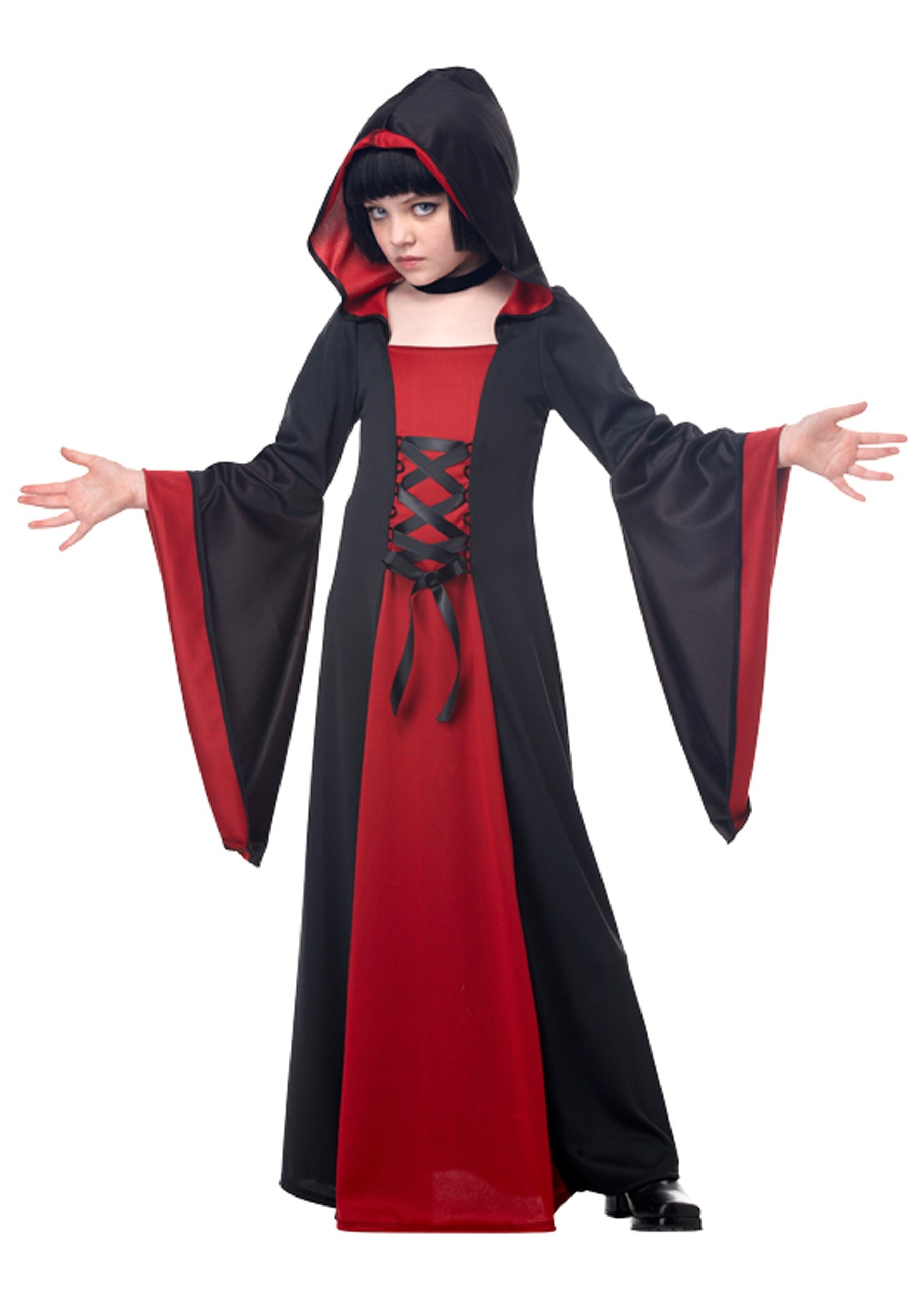 Платье чародейки детское - это длинное черно-красное платье в пол с длинными расклешенными рукавами. Его украшает декоративная атласная шнуровка. Платье с капюшоном.