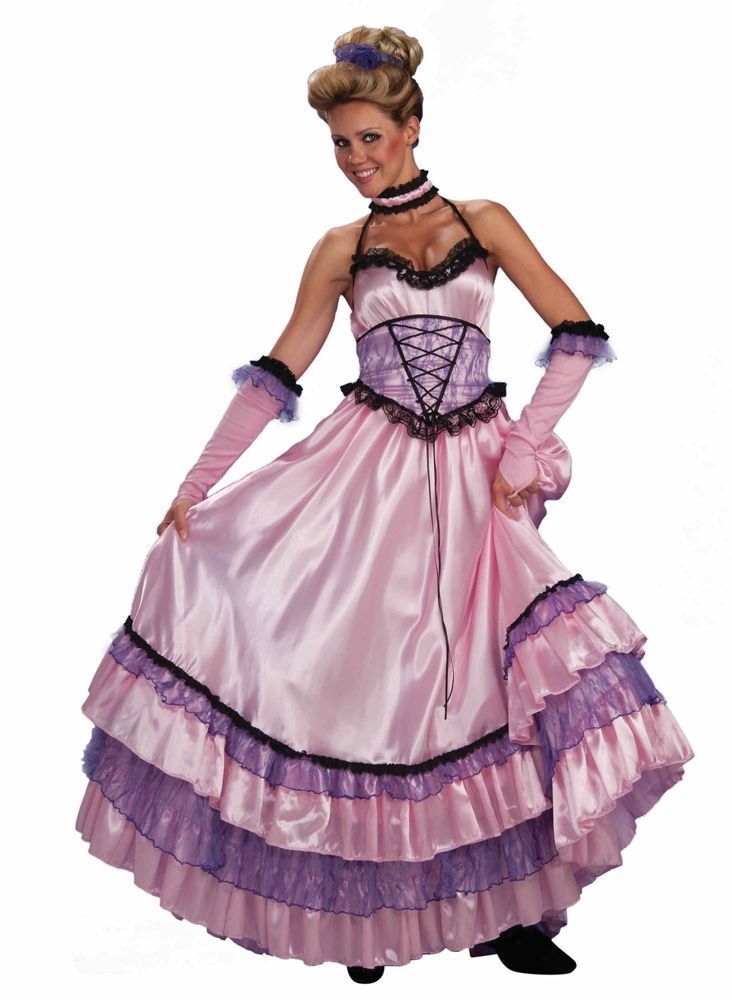 Костюм яркой танцовщицы включает в себя длинное пышное платье розового цвета с фиолетовыми кружевами и черной отделкой, также имеется корсет на талию с черной шнуровкой, головной убор, матерчатое ожерелье и розовые перчатки с фиолетовой и черной отделкой. Платье держится на тонких бретельках, плечи полностью открыты.
