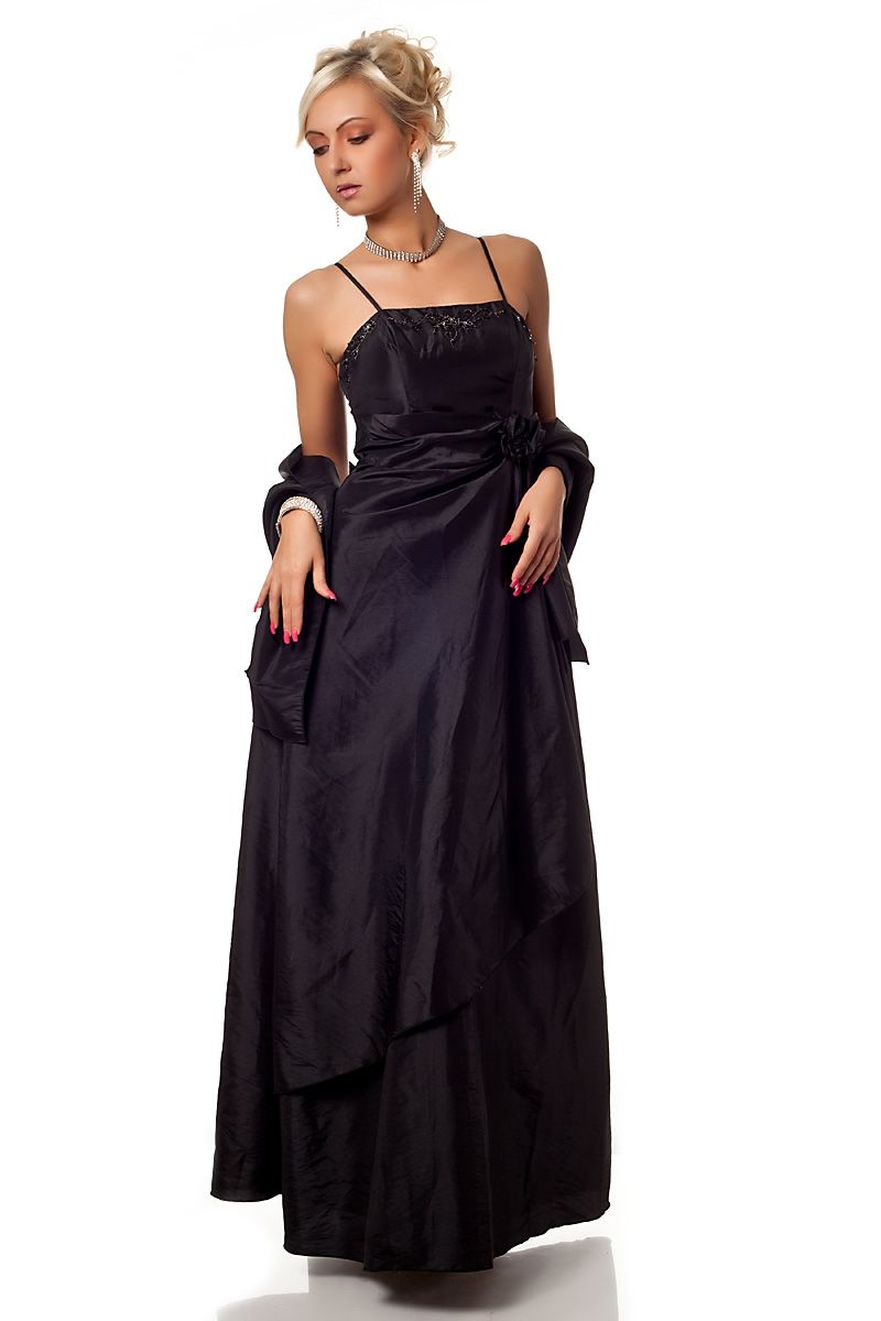 Вечернее шикарное платье - это длинное расклешенное платье черного цвета. Платье на тонких бретельках, многослойная юбка с различным уровнем слоев, под грудью красуется небольшая черная розочка, которая сплетается из складок на платье. К этому шикарному платью прилагается черная накидка на плечи.