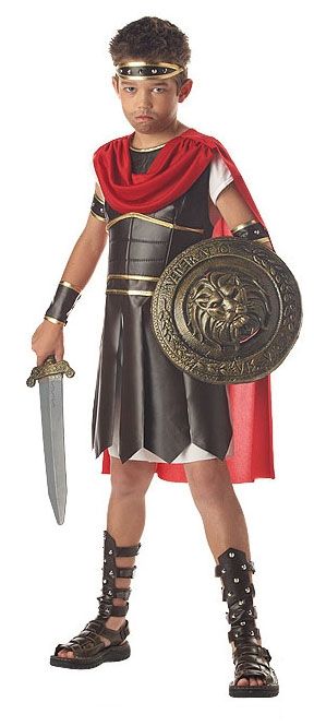 Костюм маленького Геркулеса состоит из туники, доспехов с прикреплённым плащом, нарукавных повязок, манжет, накладок на обувь и повязки на голову. Костюм выполнен из полиэстра в коричневых тонах с золотыми полосками. Щит и меч в комплект не входят, но их можно приобрести отдельно.