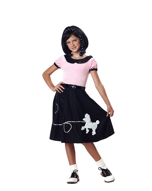Детский костюм леди 50-хх - это милая черная юбка до колен с изображением белой собачки, розовый топ с черными полосками и черный шарфик. Также черные вставки украшены блестящими пайетками. В этом милом костюме ваша девочка будет выглядеть как настоящая леди 50-хх годов.