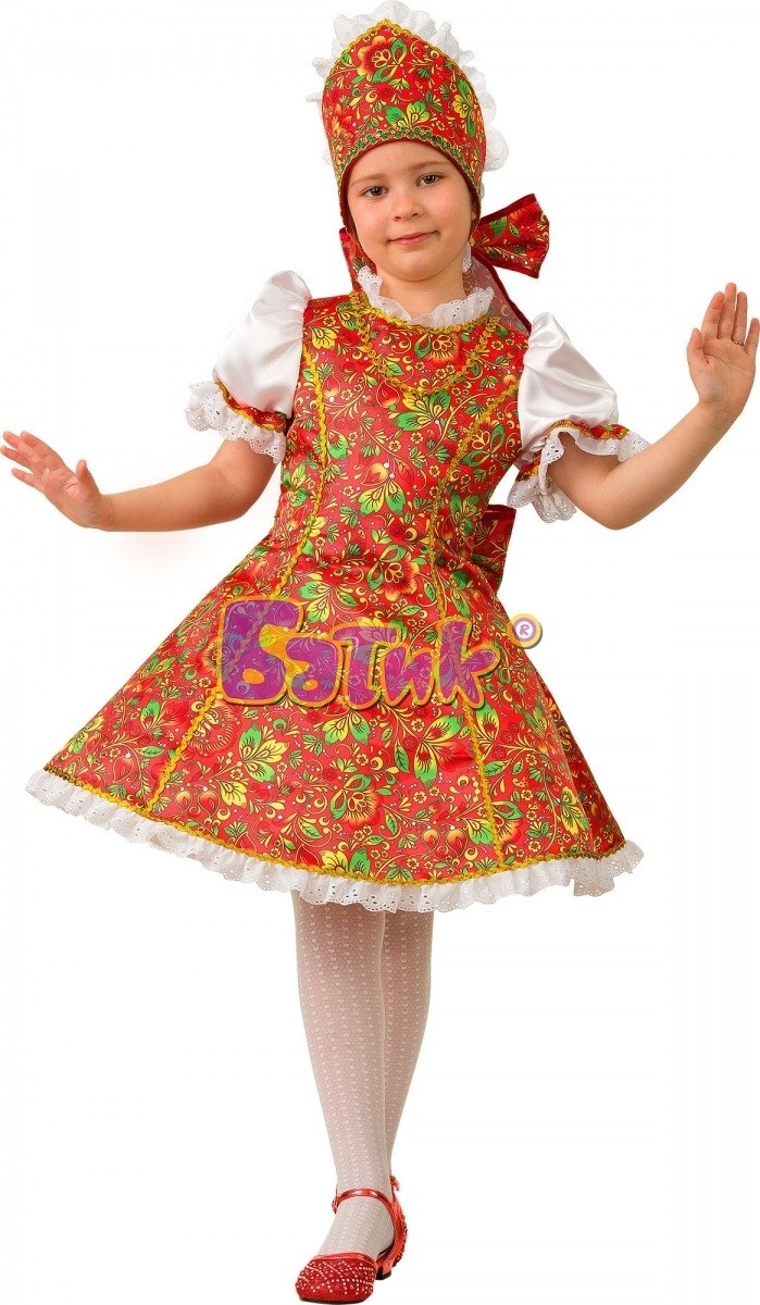 Детский костюм Марьюшки подойдет для постановки русских сказок. В комплект входит пышное цветастое платье с белыми рукавами-фонариками, к платью прилагается пышный подъюбник. Образ завершает высокий цветастый кокошник с белой кружевной отделкой.