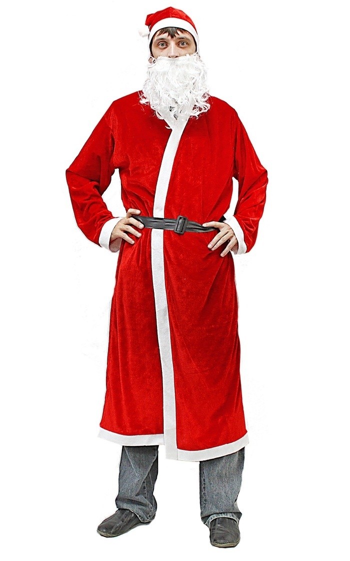 Классический костюм Деда Мороза идеален для детских утренников и корпоративных мероприятий. В комплект входит красная шуба с искусственной белой меховой отделкой, а также белая борода на резинке и новогодний колпак.
