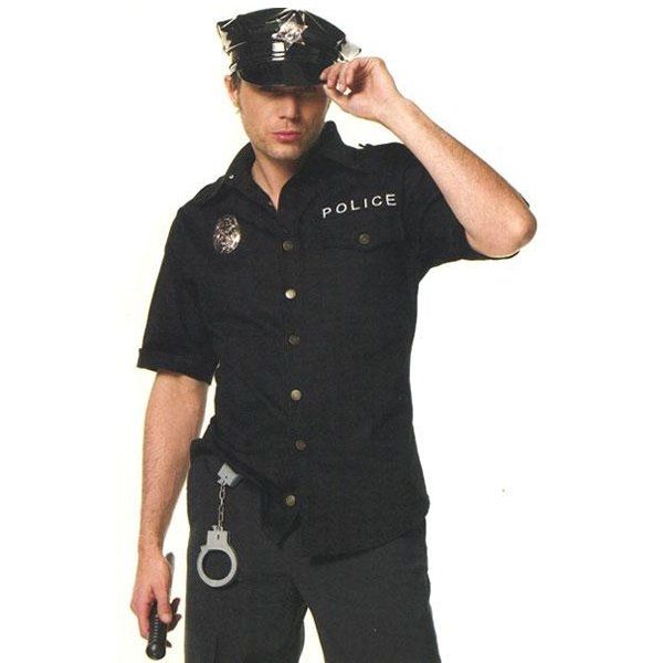 В карнавальный костюм офицера полиции входит рубашка с значком и надписью, виниловая шляпа полицейского, наручники.