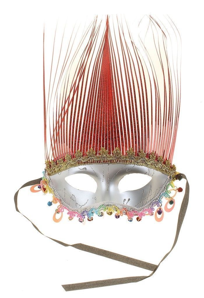 Карнавальная маска нимфы серебристого цвета с красными волосами, золотистой отделкой сверху и разноцветными бусинками снизу. Размер маски 20х36 см.