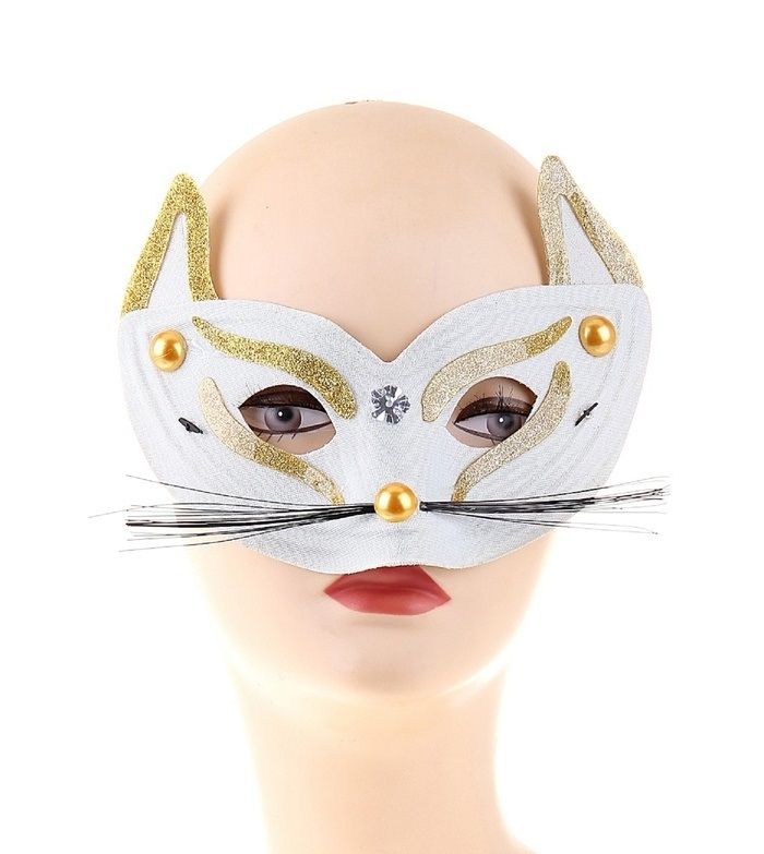 Маска кошки белого цвета с длинными черными усами, носиком в виде бусинки и острыми ушками с золотистой окантовкой. Маска кошки сделана из пластика и имеет размер 12х20 см.