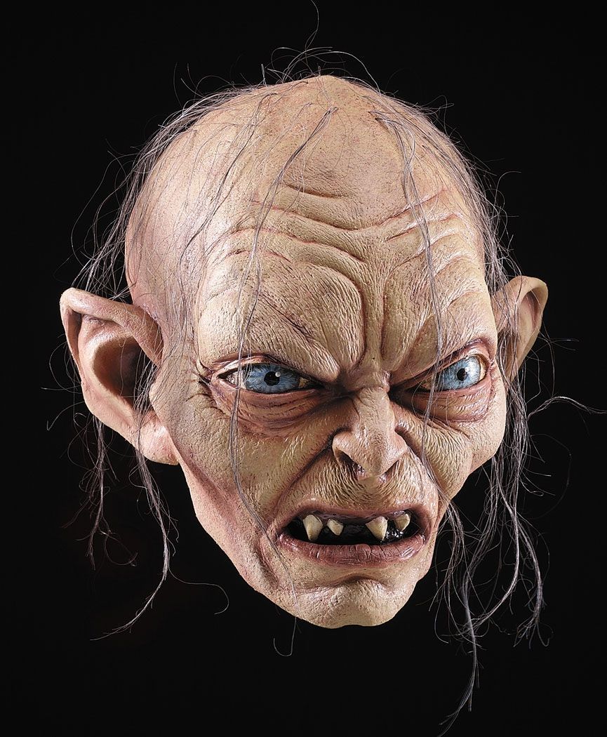 Маска Голлума выполнена из латекса. Эта маска весьма реалистична, она выполнялась в точной с одного из персонажей фильма "Властелин Колец". Кривые зубы, огромные голубые глаза и седые волосины - весьма реалистичное и жуткое зрелище.