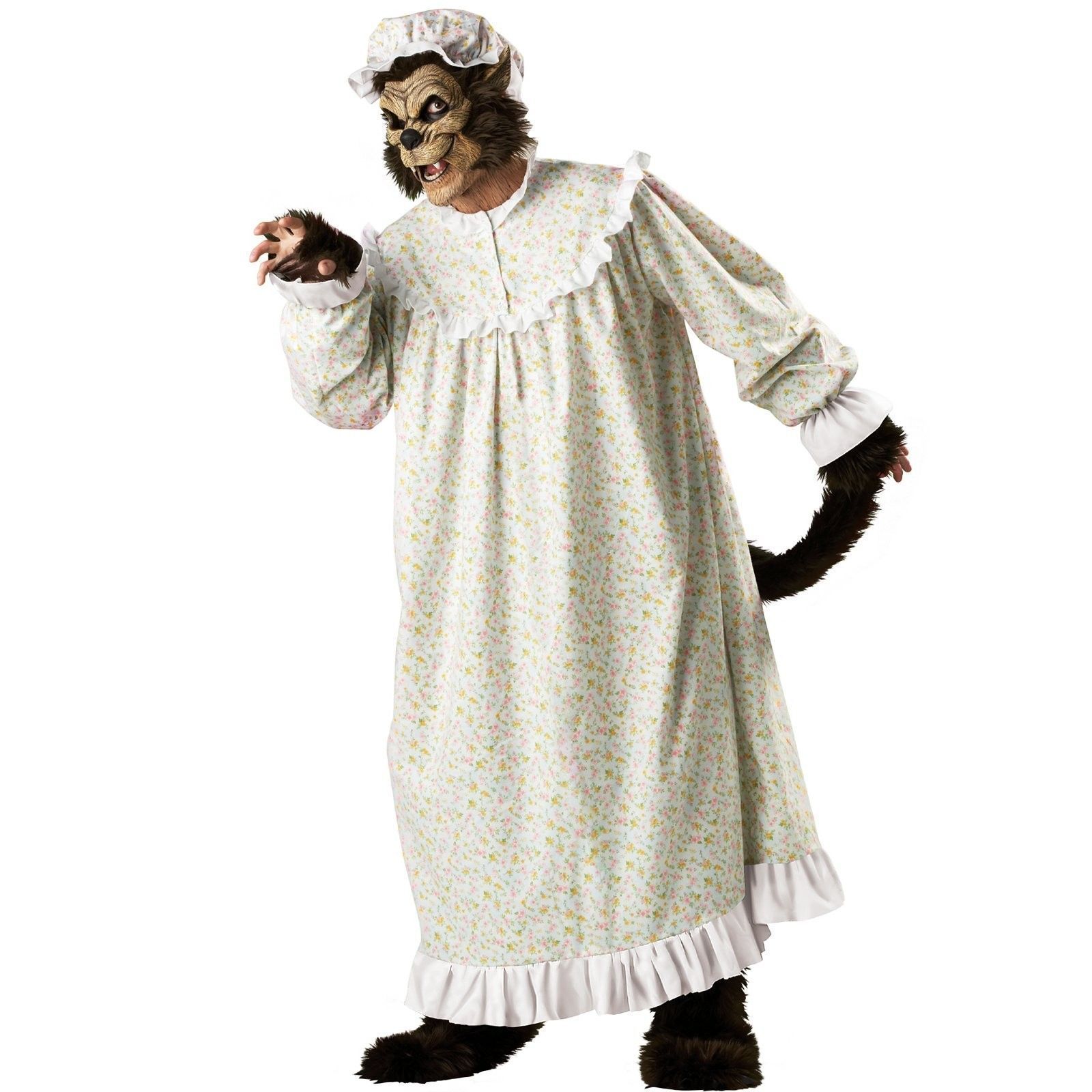В костюм волка из Красной Шапочки входит: ночная рубашка бабули с хвостом, меховые накладки на обувь, перчатки на руки без пальцев, маска, чепчик.