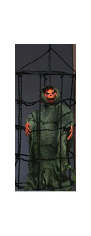 Подвесная злая тыква в клетке прекрасное украшение для вашего дома на Хэллоуин. Завидев её перед входом, ваши гости будут весьма напуганы. Подвесная тыква выполнена в оранжевом цвете, на ней имеется плащ болотного цвета. Высота декорации 45 см.