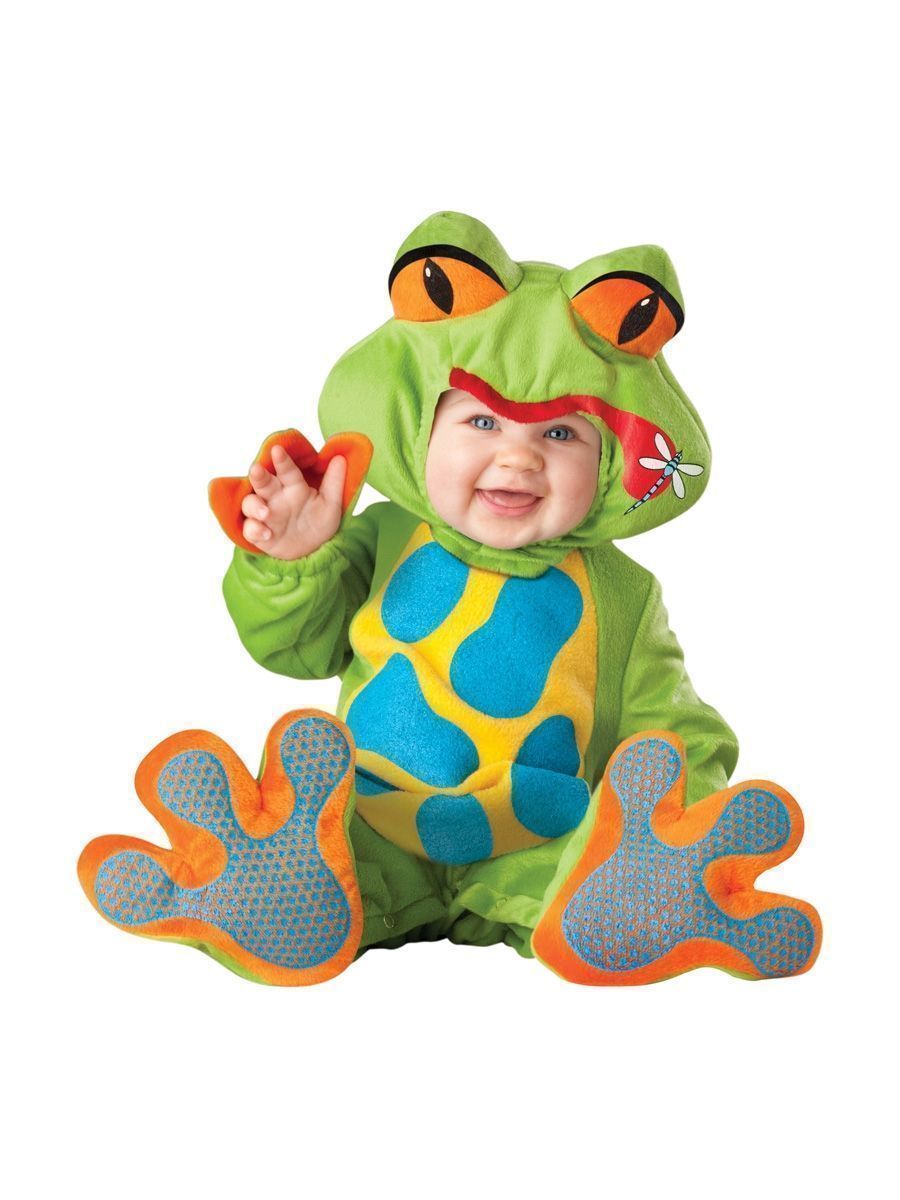 Костюм лягушки-попрыгушки - это яркий комбинезон на молнии-застежке сзади и кнопочками внизу для быстрой смены подгузника, смешной головной убор с глазами и принтом в виде язычка, на который попалось насекомое, а также мягкие тапочки с антискользящей подошвой. Следите внимательно за своим малышом, а то он может ускакать!