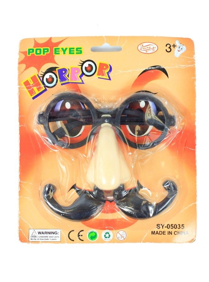 Комплект: очки, нос, усы - прекрасный аксессуар для веселых мероприятий. Комплект включает в себя круглые очки, бежевый нос и пластиковые усы.