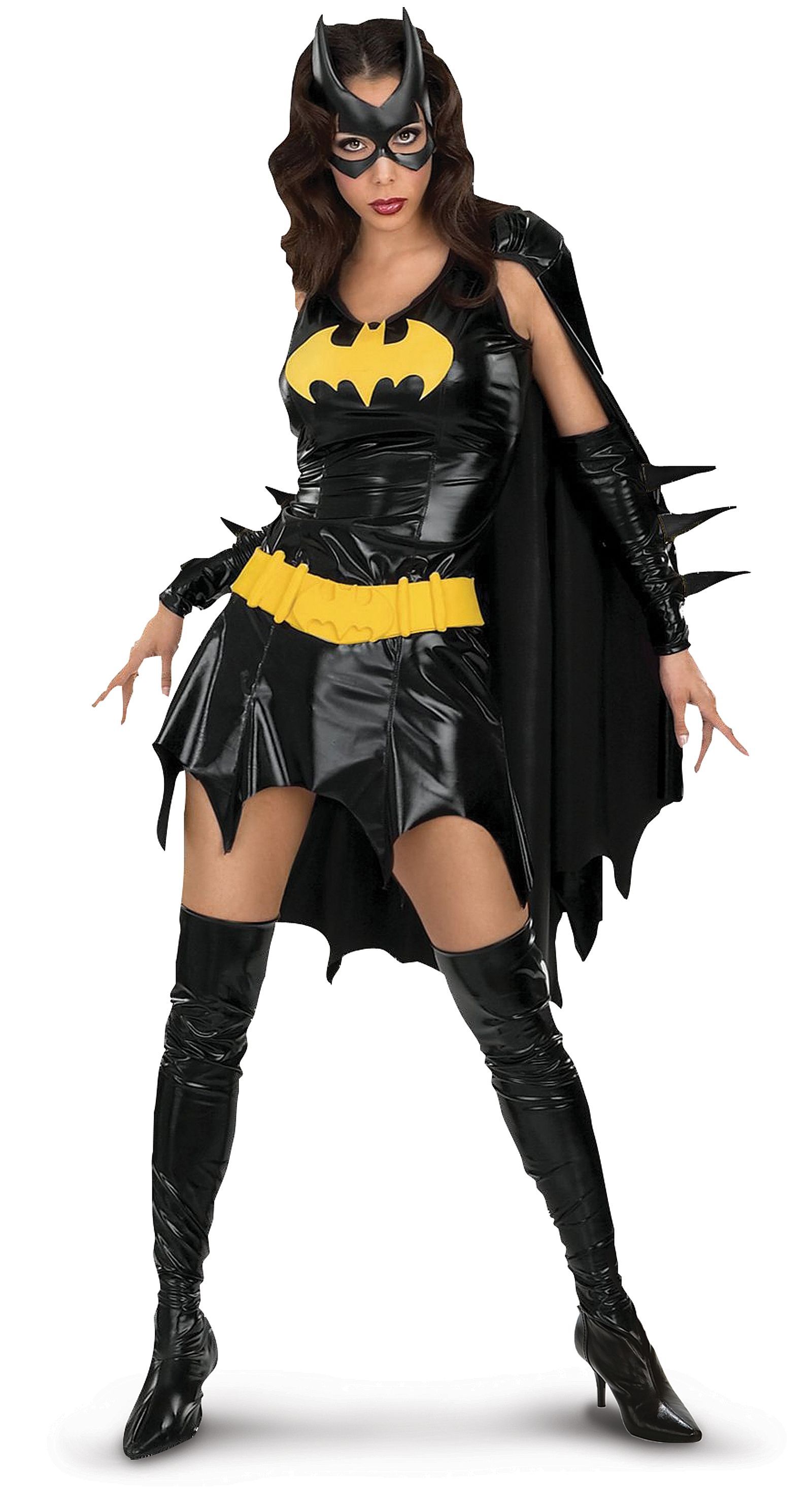 В костюм девушки бэтмена входит виниловое платье с нашивкой мыши, плащ, виниловые нарукавники, виниловая повязка на глаза, виниловый ремень, накладки на голенища.