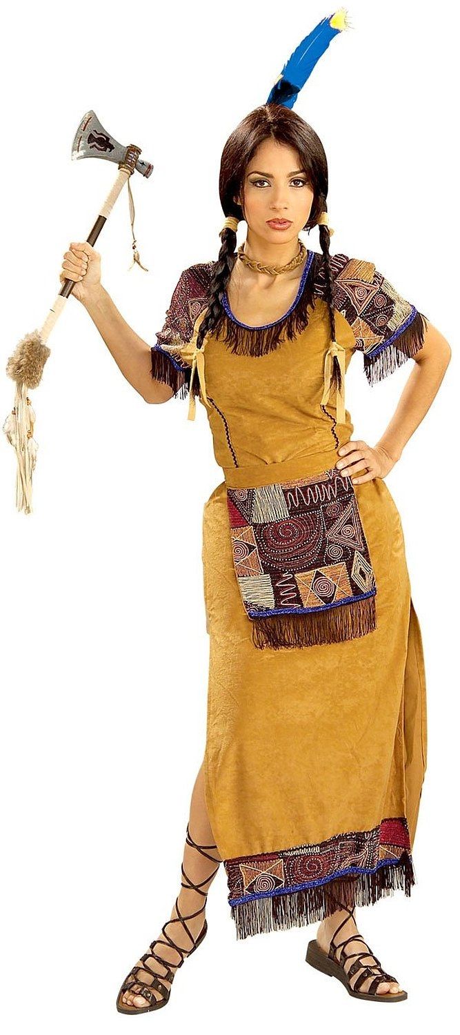 Костюм американской принцессы включает в себя длинное платье горчичного цвета, платье украшено бахромой и накладками различного цвета, также в комплект входит пояс. Оружие и головной убор в костюм не входят, но их и многие другие аксессуары вы можете приобрести на нашем сайте отдельно.