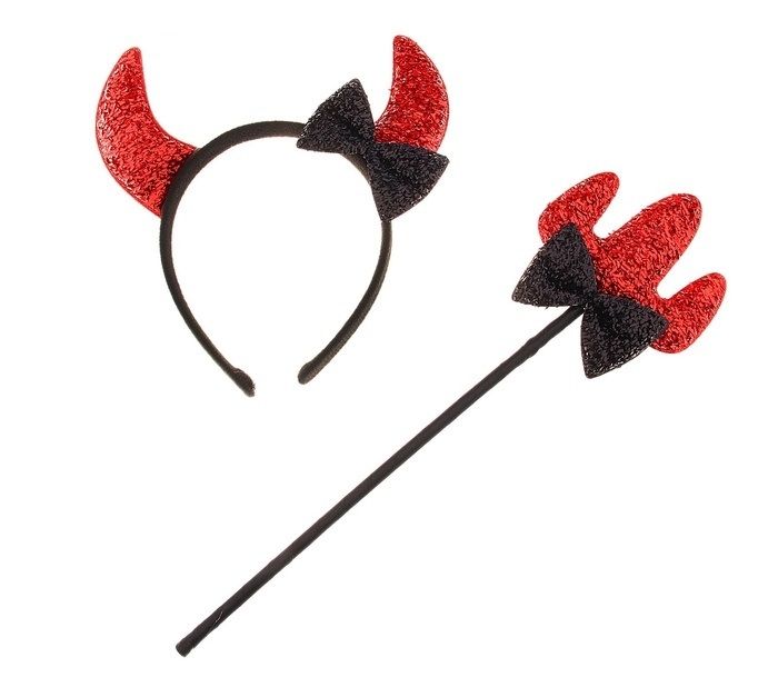 Набор дьяволенка включает в себя черный ободок с красными рогами и красно-черный трезубец. Ободок и трезубец украшены черным бантом.