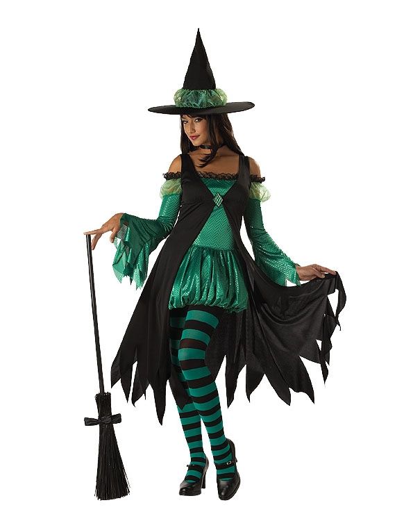 Подростковый костюм изумрудной ведьмочки выполнен в изумрудно-зеленом и черном цветах. Костюм состоит из короткого платья с длинными расклешенными рукавами и со спущенными плечами. Сверху оно украшено черным дополнительным платьем с брошью. Также в комплект входит остроконечная шляпа и полосатые черно-зеленые колготки. На этой вечеринке вам будут дозволены все шалости!