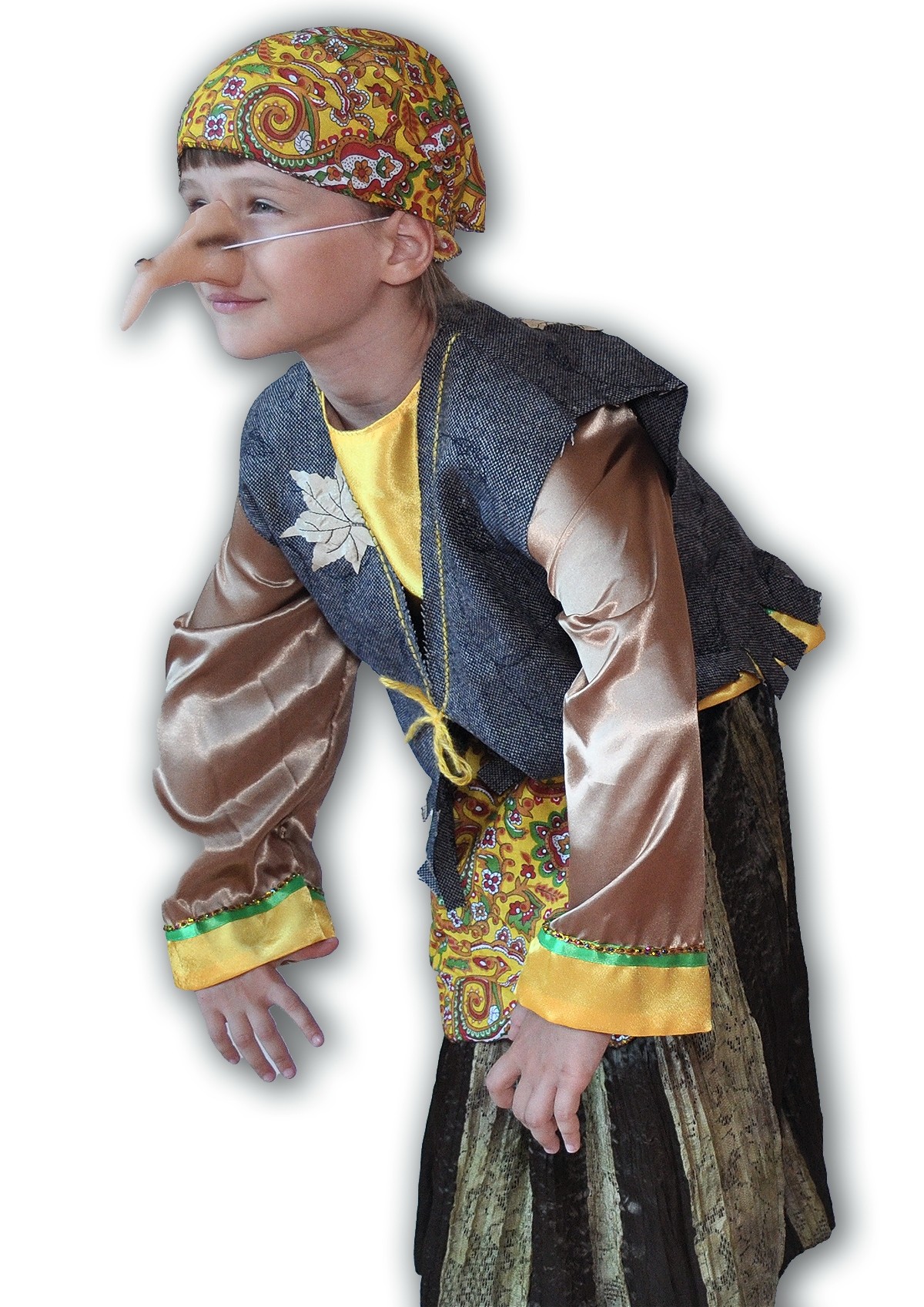 Детский костюм Бабки Ёжки идеален для постановки спектаклей на утренниках и подобных мероприятиях. Костюм сказочной бабки Ёжки включает в себя атласную блузку бронзово-желтого цвета, длинную юбку, выполненную в черно-золотом цвете, цветастый фартук, цветастую косынку на голову, а также крючковатый накладной нос на резнике.
