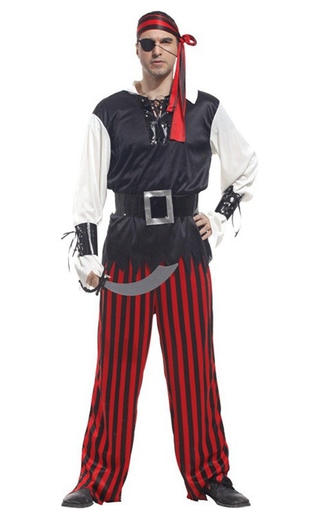 Костюм бывалого пирата включает в себя полосатые красно-черные брюки, бело-черную рубашку со шнуровкой на воротнике, повязку на голову, повязку на глаз, ремень и два браслета на руки.