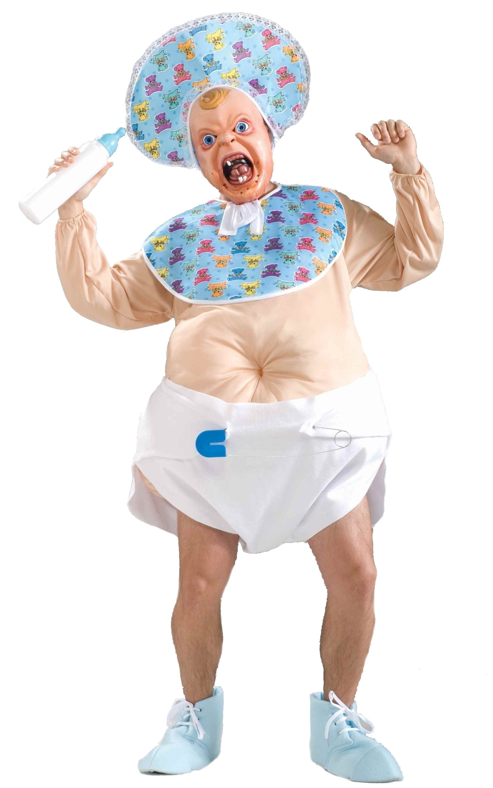 Что может быть хуже, чем вечно кричащий ребёнок, который не успокоится пока не получит, то что хочет. Костюм маленького кошмара мамы как раз олицетворяет это. В комплекте имеется большой чепчик и слюнявчик, пластиковая маска кричащего ребёнка, большое накладное мягкое тело и подгузники.