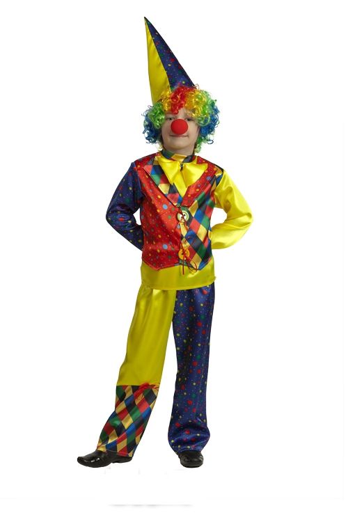 В состав костюма клоуна в колпаке входят цветной колпаки и парик, а также яркие штанишки и рубашка.