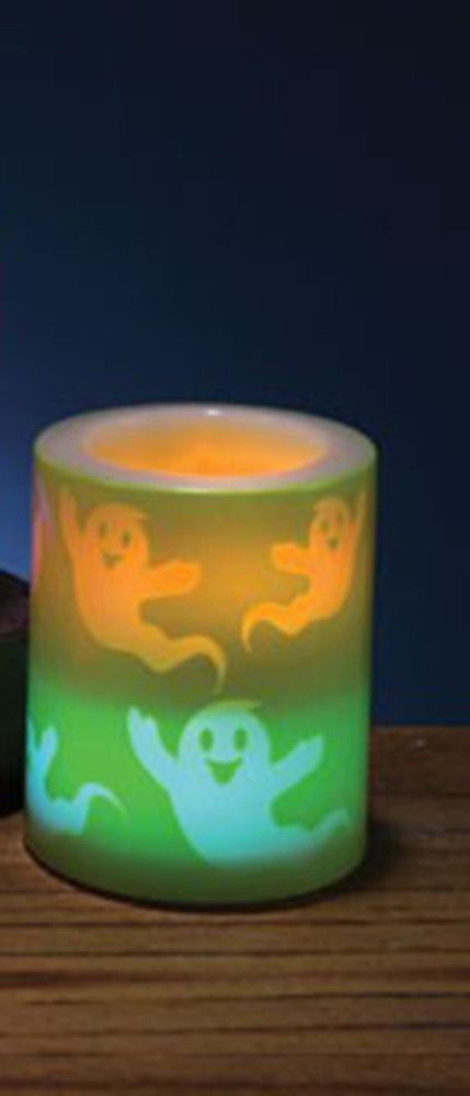 Светодиодная свеча с привидениями - это зеленая небольшая свеча, которая светится оранжевым светом. На свече изображены силуэты добрых привидений. В комплекте со свечой идут две батарейки CR 2032.