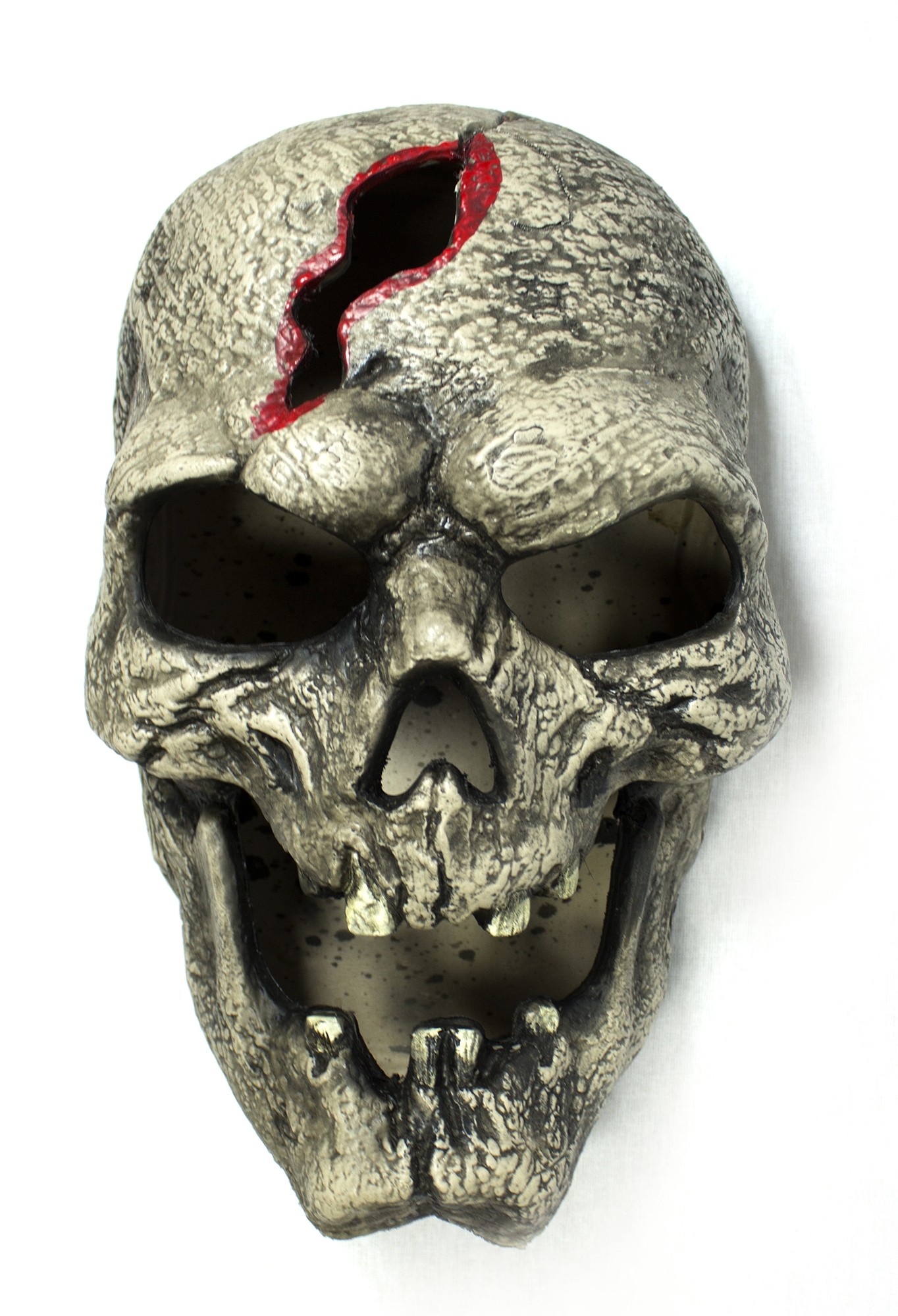 Пластиковый череп с трещиной выполнен из прочного пластикового материала серого цвета. Декорация представляет собой жуткий череп с трещиной во лбу.
