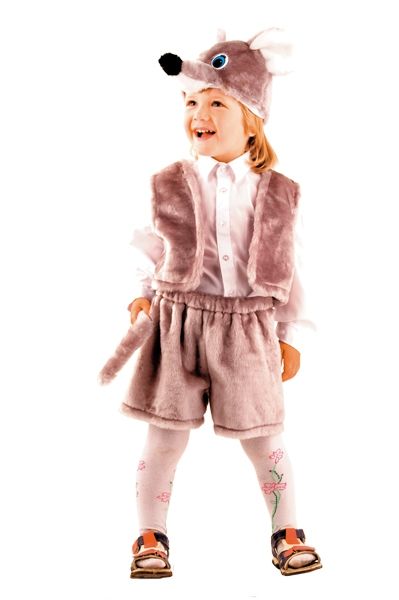 Костюм серенького мышонка состоит из шортиков с хвостом, жилетки и забавной шапки-маски. Наряд сделан из меха, которые не создаёт дискомфортов малышам.