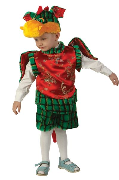 В комплект карнавального костюма доброго дракончика входит шапочка в форме головы дракона, безрукавка с крылышками и шорты.