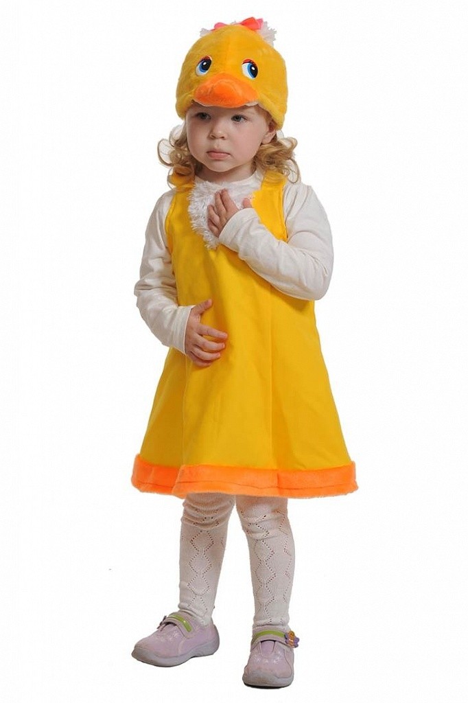 Детский костюм уточки выполнен в ярких оранжевых и желтых цветах. В комплекте платье с меховой отделкой и маска-шапочка из плюшевого материала.