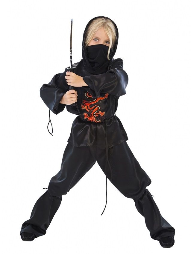 Костюм Ниндзя с драконом включает в себя черную рубашку с капюшоном и длинными рукавами, спереди ее украшает нашивка в виде красного дракона. Также в комплекте имеется пояс, штаны свободного кроя и маска на пол лица.