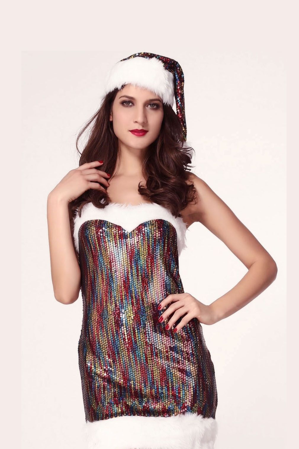 Костюм радужной Санты - оригинальный наряд для Новогодней вечеринки. Сексуальное платье без бретелек расшито разноцветными пайетками, подол и лиф декорирован искусственным мехом. Платье сзади имеет белую шнуровку. Дополняет образ колпак с помпоном в цвет платья.