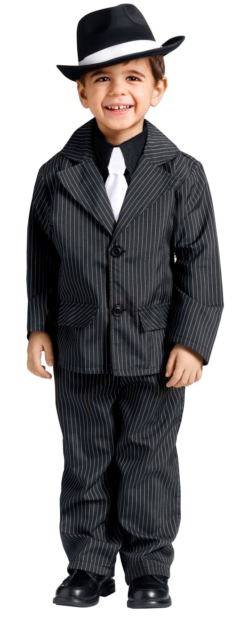 Костюм малыша гангстера включает в себя черный пиджак с белыми тонкими полосками. Пиджак на пуговицах. Также в комплекте имеются соответствующие брюки, черная манишка и белый галстук.