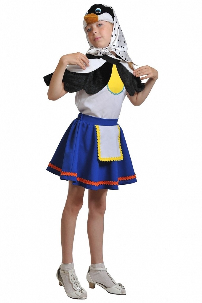 Детский костюм Сороки-Белобоки отлично подойдет для постановки детских спектаклей. В комплекте костюма синяя юбочка с пришитым белым передником, белая блузка, черная накидка, выполненная в виде крыльев, маска-шапочка и белая косынка в черный горох.