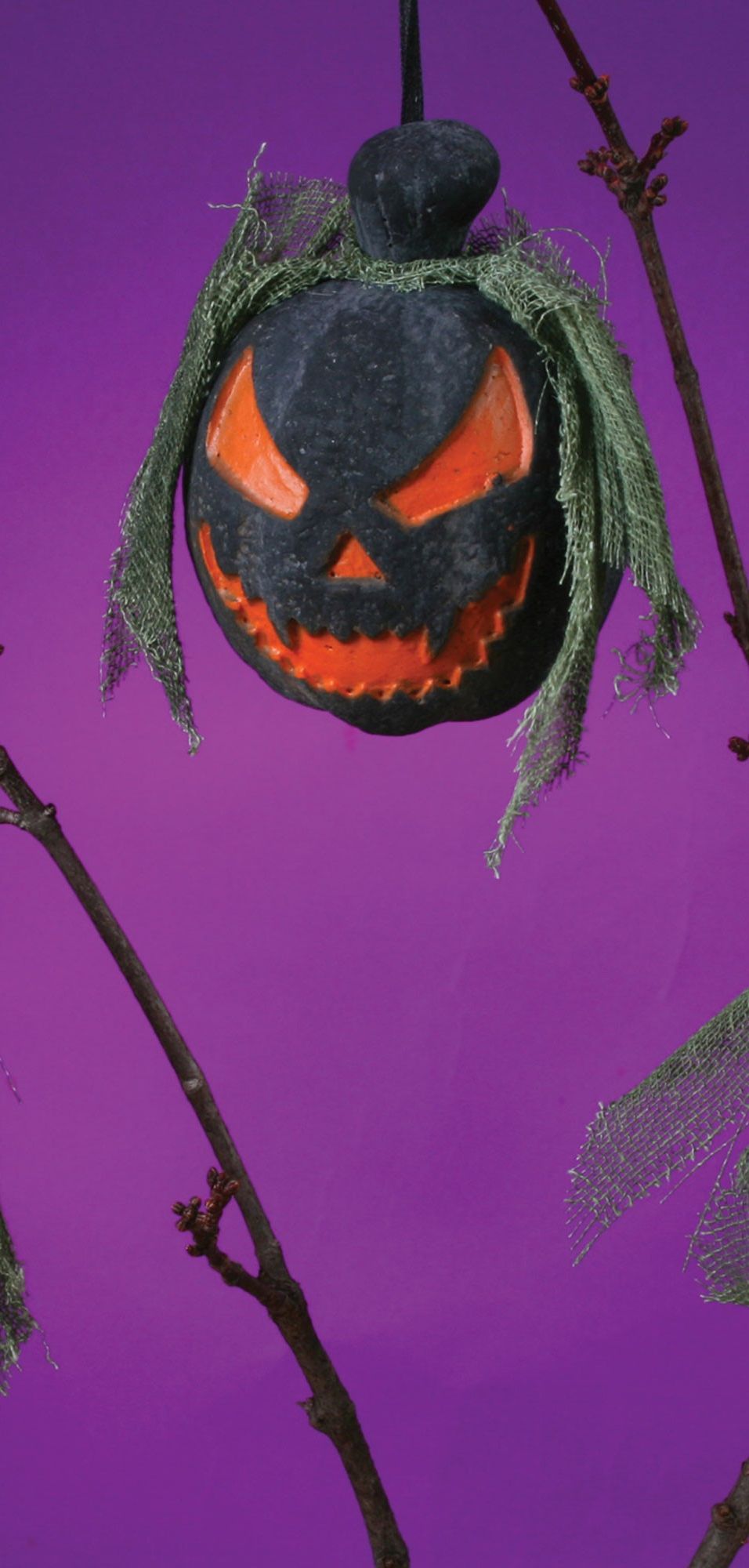Подвесная мини-тыква черная - это подвесная декоративная голова-тыква со злобной вырезанной мордочкой. Тыква выполнена в черном цвете, а вырезанные части в оранжевом. Тыкву покрывает зеленый рваный материал. Фигурка подвешивается за черный шнурок.