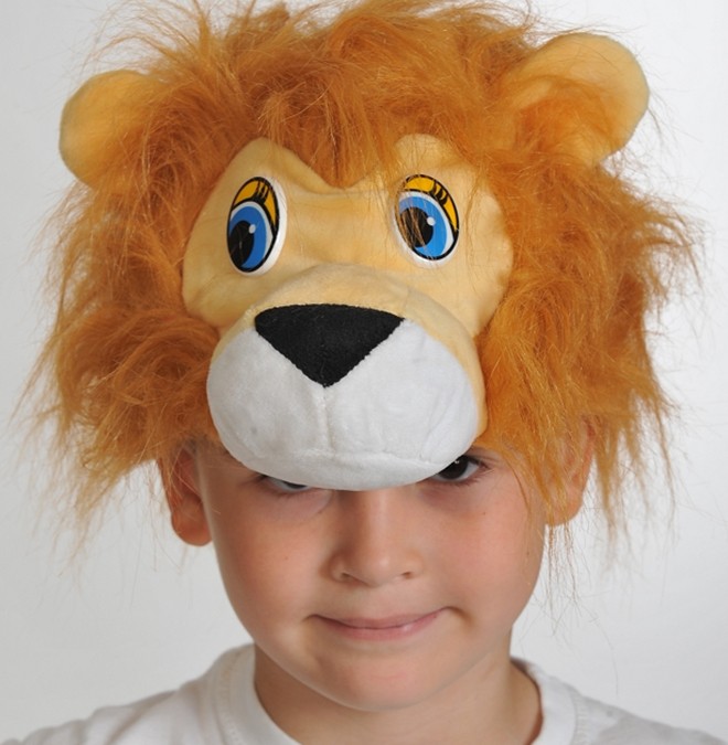 Плюшевая маска Львенка выполнена из мягкого материала светло-коричневого цвета в виде мордочки льва с пушистой коричневой гривой.