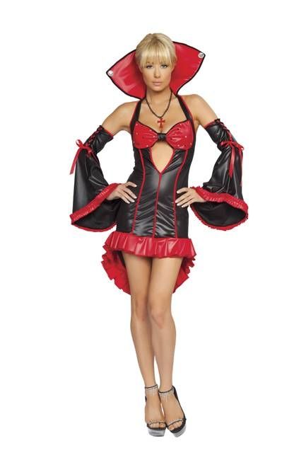 Стильный и элегантный костюм подружки знаменитого графа Дракулы - короля всех вампиров. В костюм подружки Дракулы входит платье с высоким воротником и отдельными широкими рукавами. Имитация винила.