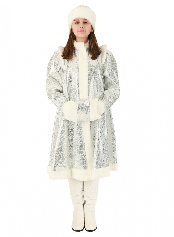 Серебряный костюм Снегурочки - блестящий узорчатый костюм, в комплект которого входит свободная шубка с белой меховой отделкой, шапка с меховой отделкой, а также серебряная муфта на шнурках, которая также отделана белым искусственным мехом.