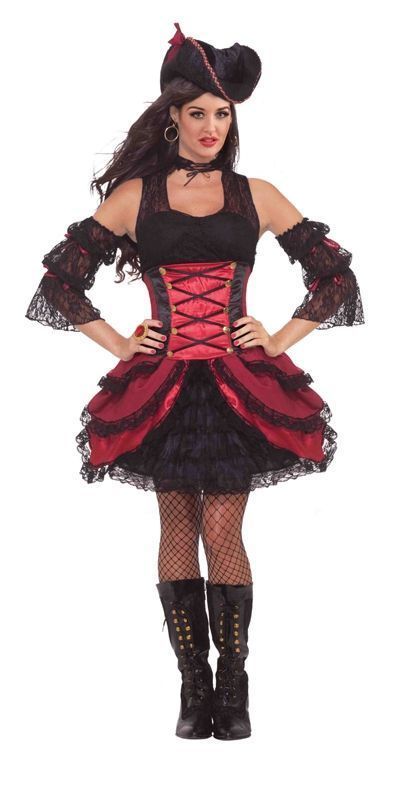 В комплекте костюма имеется топ с корсетом, пышная юбка, отдельные рукава и конечно же, пиратская шляпа. Наряд мошенницы-пиратки выполнен в красно-чёрном цвете, а как известно, эти цвета идеально сочетаются друг с другом.