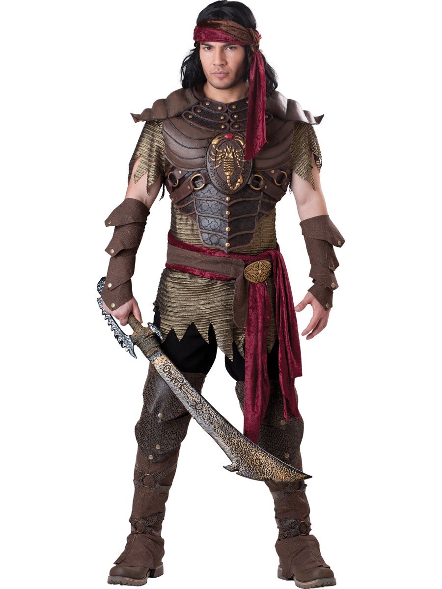 Этот костюм воина скорпиона непременно подойдёт все отважным мужчинам. В комплекте этого костюма имеется кольчуга, броня для груди, перчатки без пальцев, повязка на голову, ремень, пояс , накладки на сапоги и на ноги. Надев подходящие штаны и взяв в руки меч, вы будете настоящим бесстрашным воином скорпионом.