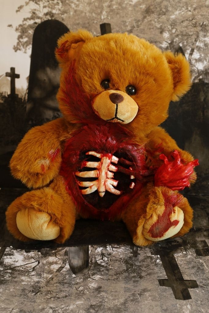 Зомби-мишка Романтик - плюшевый мягкий мишка, с сердцем в лапке, которое он вырвал из своей груди и готов подарить его! Разве это не самое лучшее проявление любви!? Живот у мишки разорван и видна грудная клетка, и вокруг все покрыто кровью.