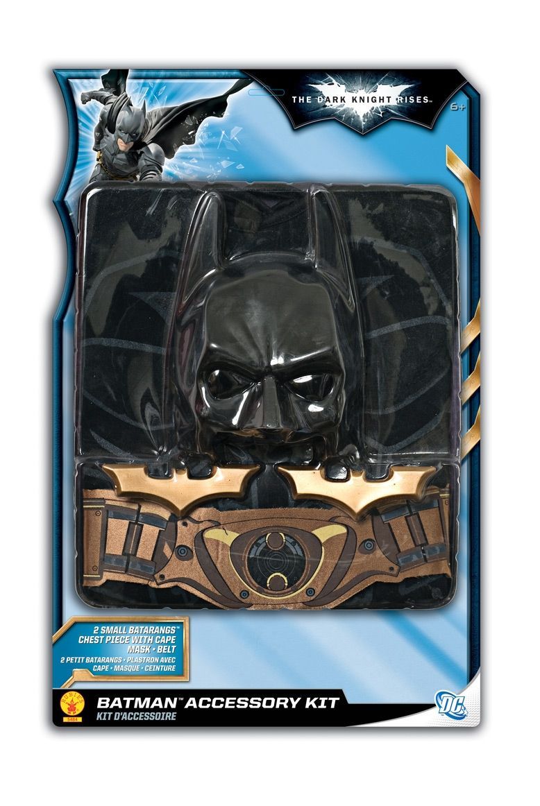 Детский набор Бэтмена поставляется в блистерной упаковке. В комплект входит нагрудник с принтом, плащ-накидка, коричневый ремень, маска на пол лица и два бэтаранга.