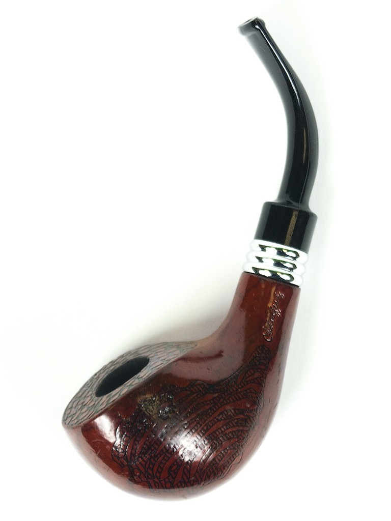 Курительная трубка Шерлока выполнена в темно-коричневом цвете из дерева. Мундштук выполнен в черном цвете. Трубку украшают резные узоры.